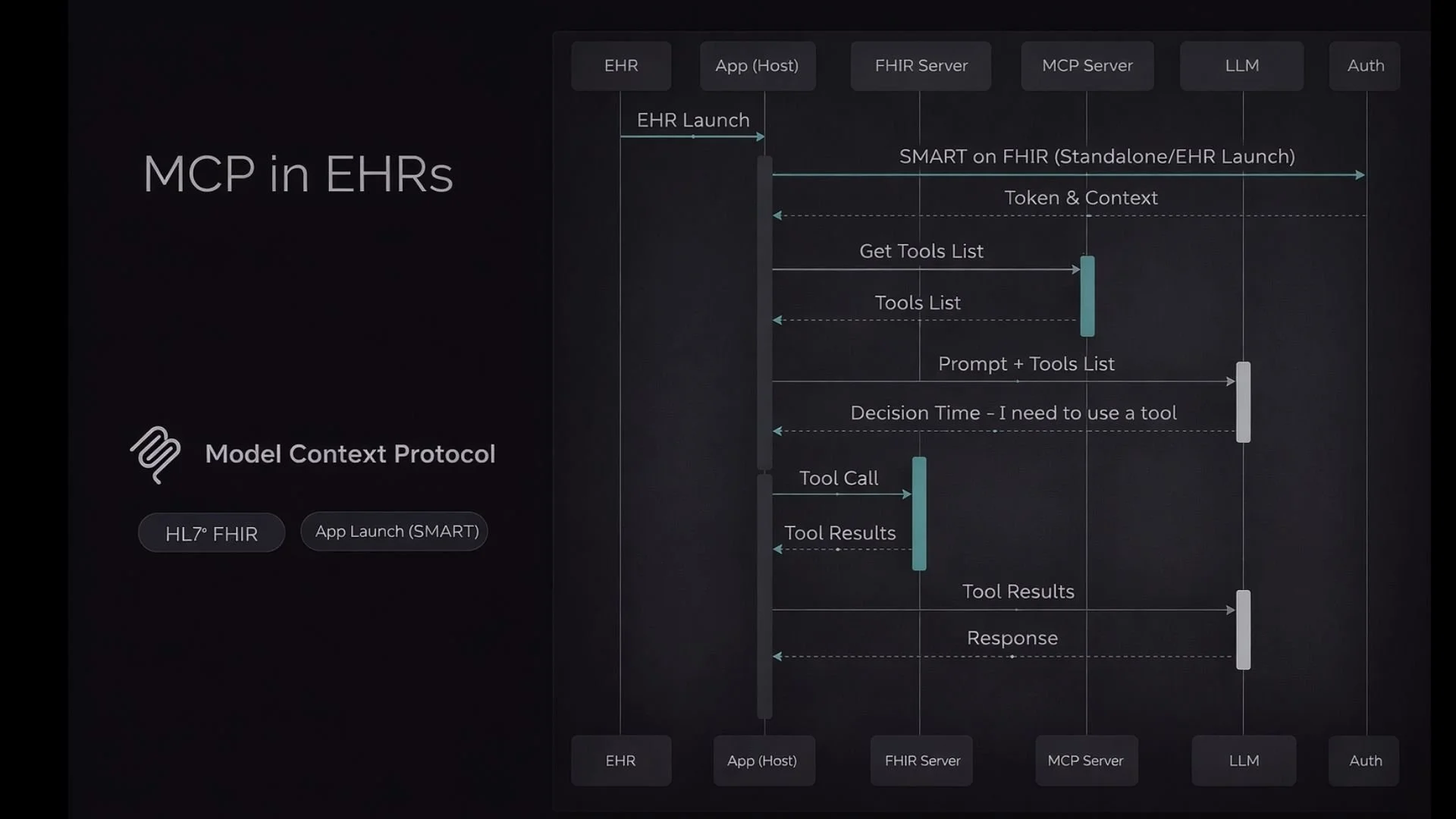 LLMs are powerful, but without structured access to real-time data, they are limited. SMART on FHIR already provides authenticated, scoped access to clinical data. MCP provides the standardized bridge between LLM reasoning and those tools.